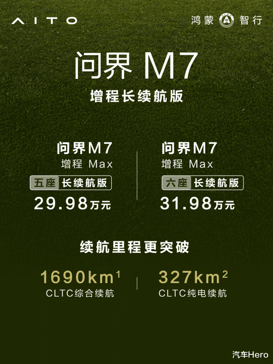 同日,全新问界M7增程长续航版正式上市,其中增程Max五座长续航版售价29.98万元,增程Max六座长续航版售价31.98万元,即刻下定,可享受至高60000元购车权益。