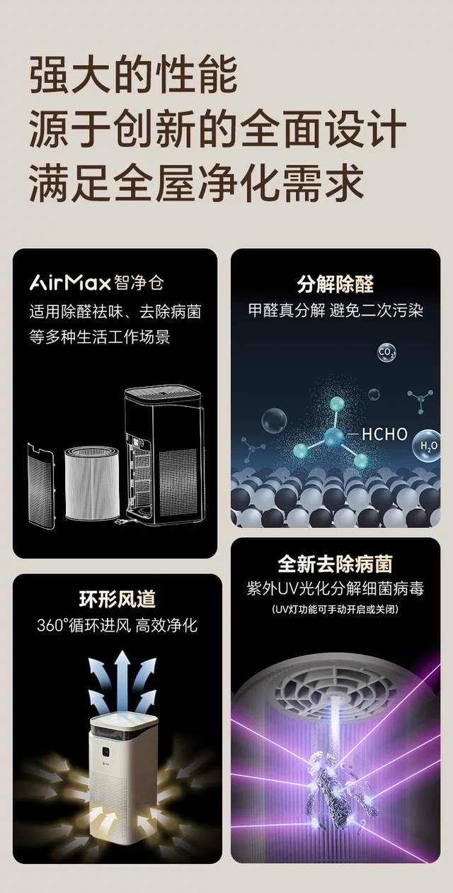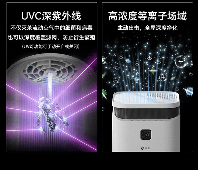 双重除菌功能,守护全家健康该净化器的除菌能力同样出众。它内置UV灯和等离子,双重灭杀病毒细菌,对冠状病毒去除率高达99.99%(中科检测,报告编号: JKK23020114C)。对于有老人、孩子的家庭,这一功能尤为关键,能有效去除空气中的有害病菌,为全家呼吸健康筑牢防线。