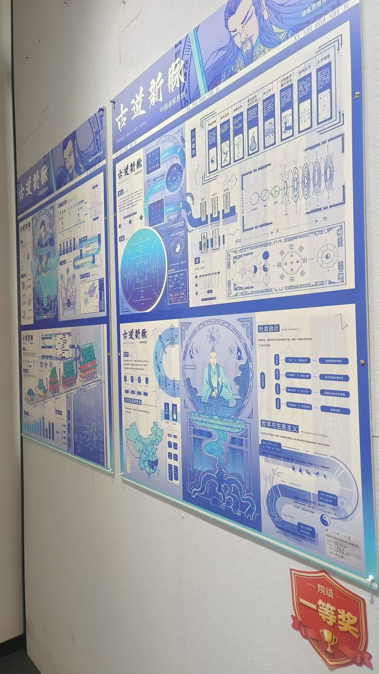 展览现场,百余件学生作品错落陈列,涵盖数字艺术、传统工艺、视觉设计等多个领域,充分展现了视觉传达系学子扎实的专业功底与大胆的创新思维。人工智能与艺术课程作品中,学生们运用AI技术赋能创意表达,将算法逻辑与美学理念深度融合,创作出兼具科技感与艺术性的视觉作品;国潮非遗文创设计课程则聚焦传统文化活化,学生们从非遗技艺、传统纹样中汲取灵感,设计出茶具、饰品、包装等系列文创产品,让传统美学在现代生活中焕发新生。各课程作品风格鲜明、创意多元,既体现了课程教学的专业特色,又呼应了“融合突破创新”的展览主题。