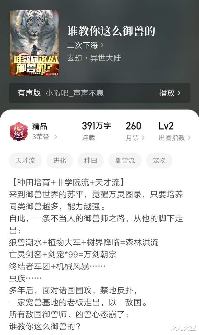 主角自家也有一个宠兽培育基地,由此开始了主角的御兽培养之路,小说看着有五千均以上的成绩。御兽文热度逐渐过去的情况下,这个成绩还是不差的。