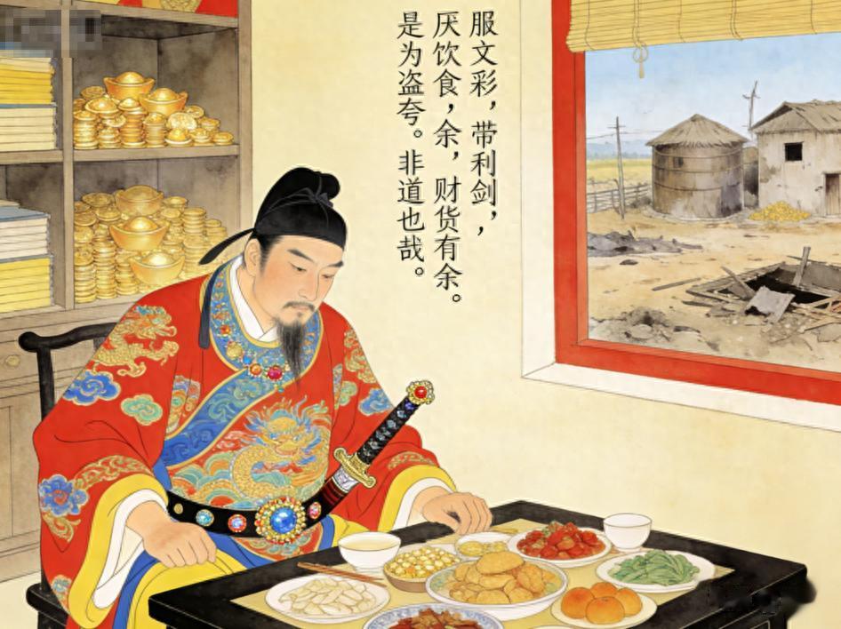 批判奢靡统治者:权力的异化与 “盗夸” 本质老子在《道德经》第五十三章中,以犀利的笔触,将批判的矛头直指那些奢靡无度的统治者,发出了 “服文彩,带利剑,厌饮食,财货有余。是为盗夸。非道也哉” 的强烈谴责。这短短数语,如同一把利刃,剥开了统治者奢靡生活的华丽外衣,揭示了其行为的本质 —— 权力的异化与对民众的掠夺。