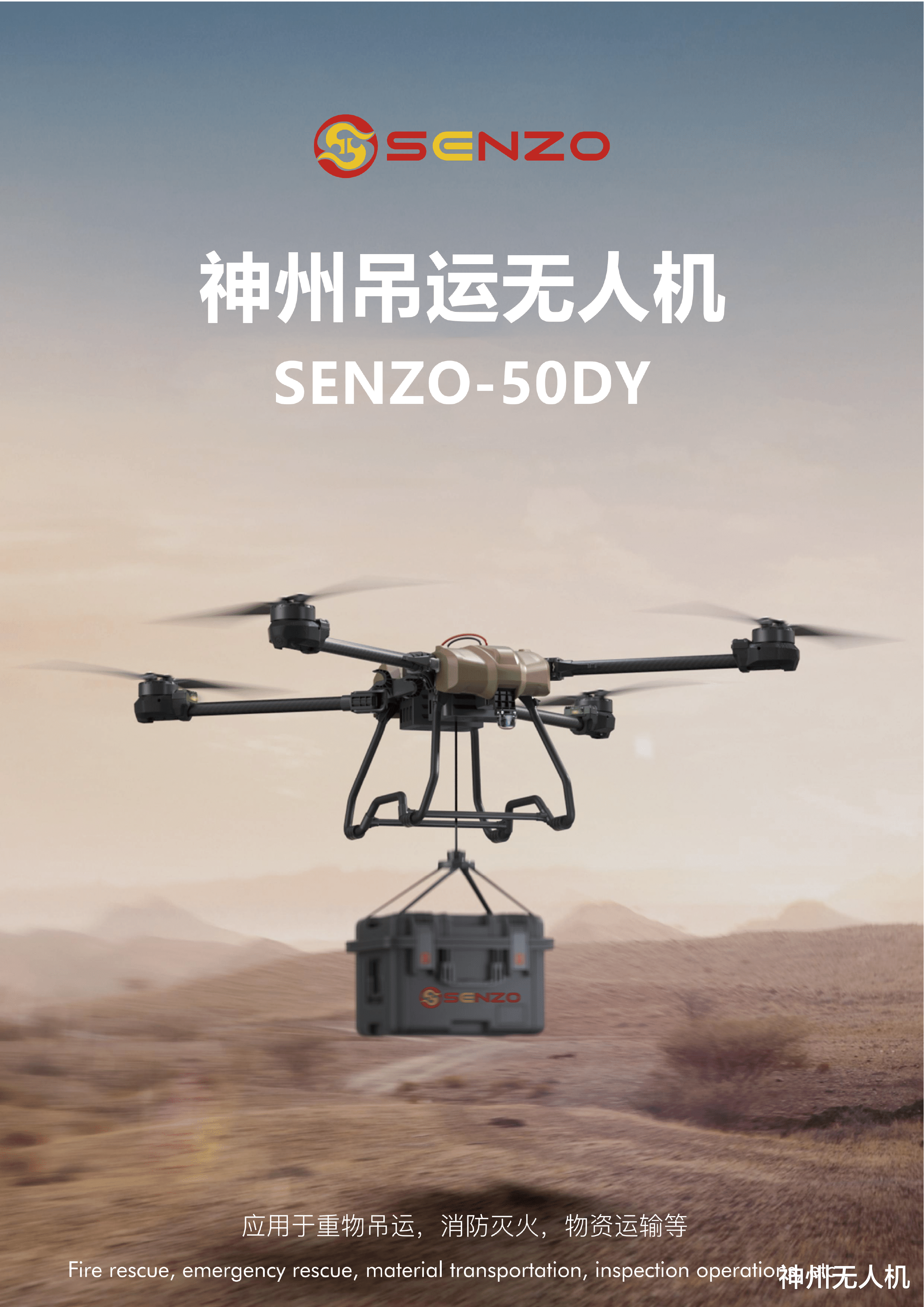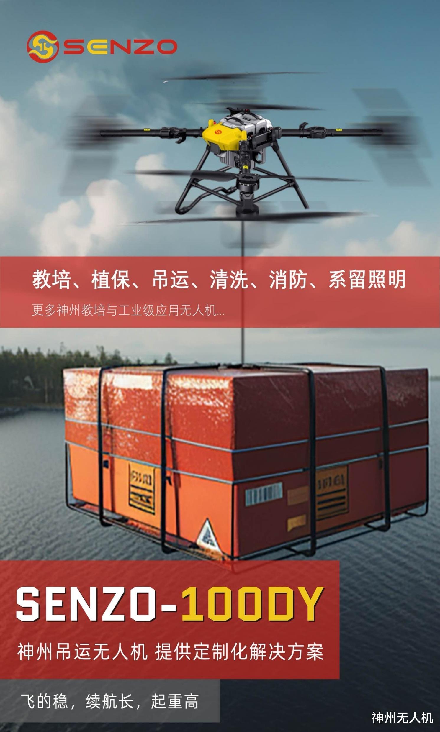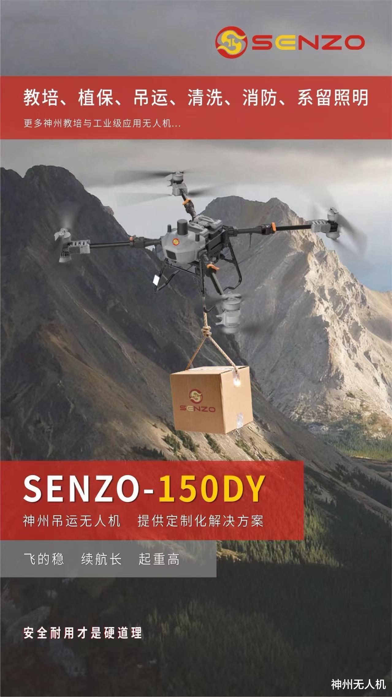 SENZO-100DY:载重100kg,平衡性能与成本。配备自适应悬停技术,在风力环境下稳定性优于竞争对手,解决飞手对恶劣天气的担忧。效率比人力高4倍(如运输中小型建材)。
