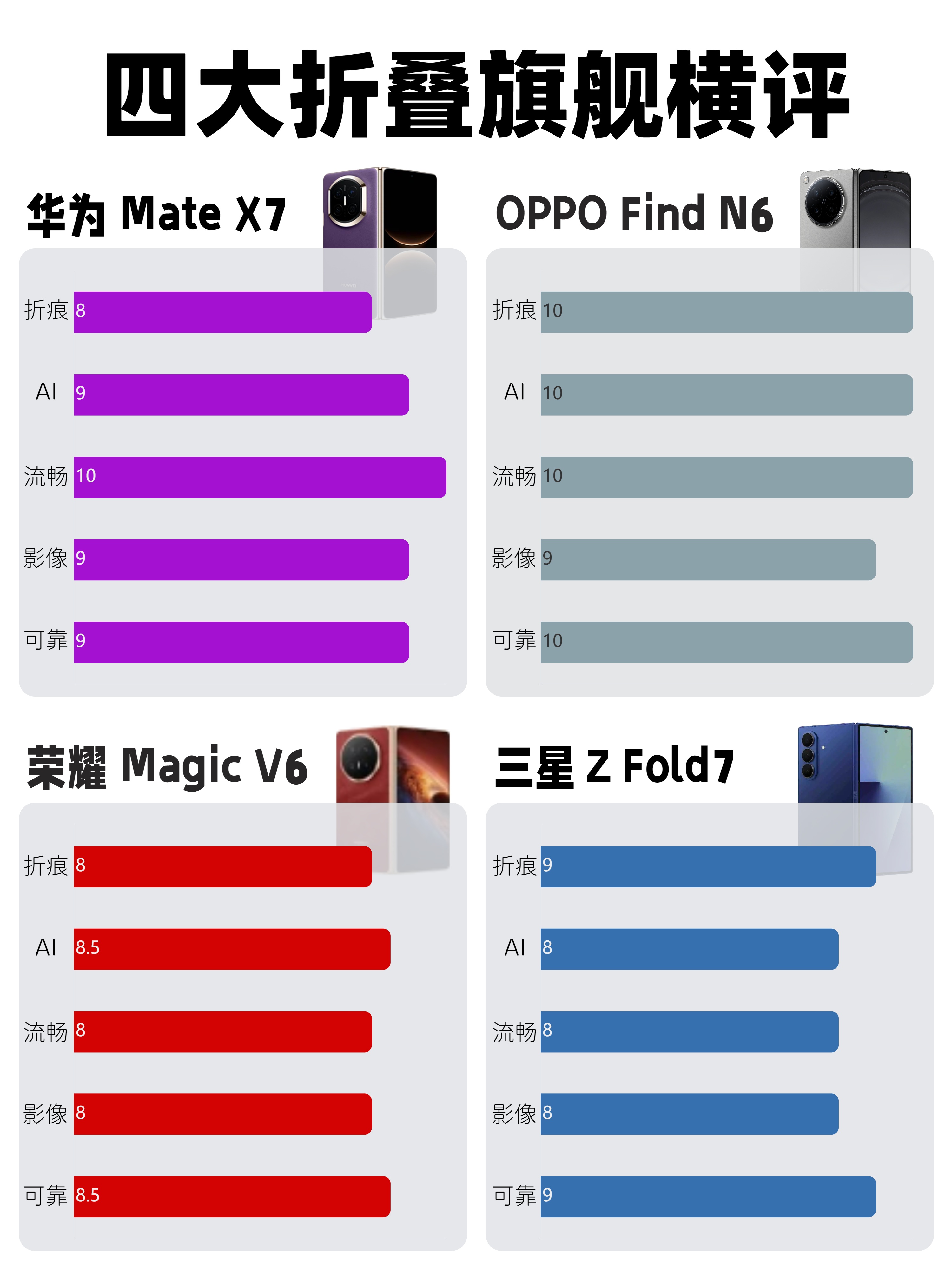 先说说上手的感觉,三星ZFold7是真的轻,215克拿着跟直板机差不多,合起来也就8.9毫米;华为Mate X7的光织云锦纹理看着挺高级,但236克还是稍微沉了点;荣耀Magic V6也很薄,手感不赖;OPPO Find N6同样做得挺轻薄,合起来的厚度感觉刚刚好,挺舒服的。