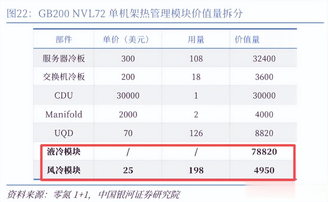 根据市场机构测算,单AI机柜液冷方案成本约5–10万美元,为风冷的5–15倍;