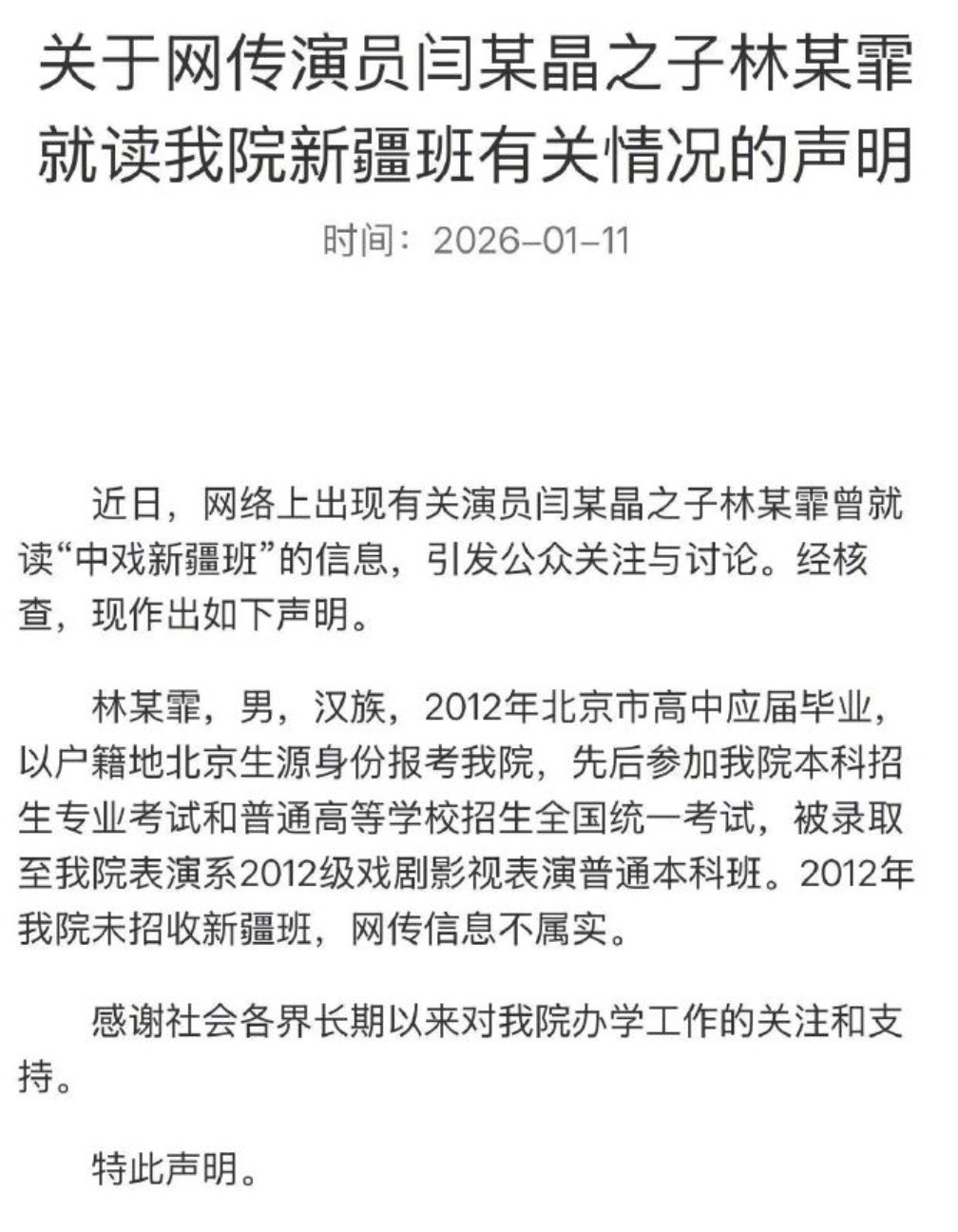 中戏此前倒是发过声明,说林傲霏是2012年北京某高中的应届毕业生,通过正常考试录取到普通本科班,但通篇没提关键的录取分数,也没公示当年的完整录取名单,更没解释“新疆班”的说法从何而来。