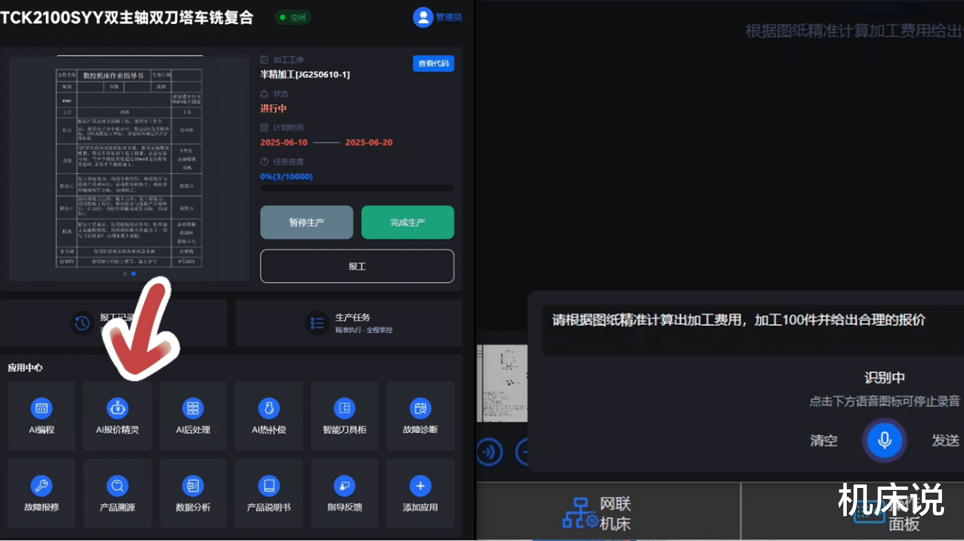 山东大汉智能机床厂推出的AI 报价精灵功能,正是破解报价痛点的核心方案。企业只需上传 PDF/JPG/PNG 格式的产品图纸,再通过语音输入加工要求(例如 “加工 100 件,表面精度 Ra1.6,给出最优报价”),系统就能自动拆解工序、核算材料成本、评估加工工时与工艺难度,同步生成批量优惠方案,全程仅需 3 分钟即可输出初步报价方案。后续仅需 1 天的人工优化,就能完成过去 10 人 10 天的工作量,大幅压缩了报价周期,也降低了人力成本。