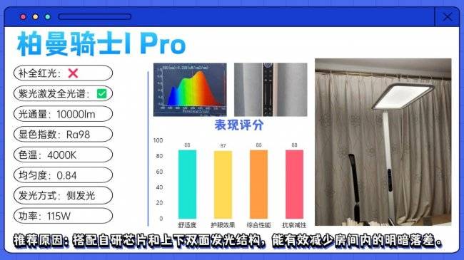 护眼大路灯第三名:柏曼骑士I Pro;搭配自研芯片和上下双面发光结构,能有效减少房间内的明暗落差。