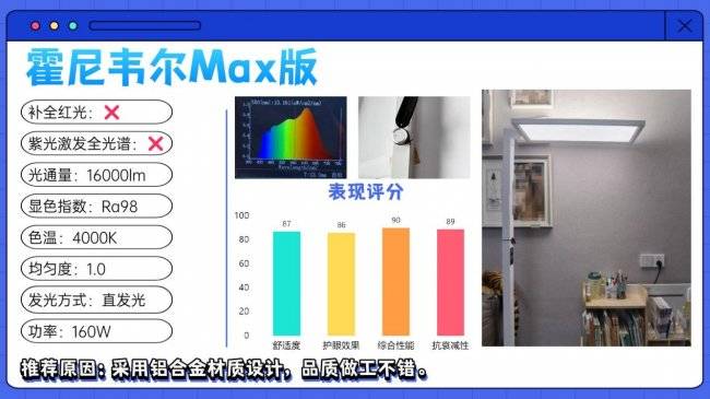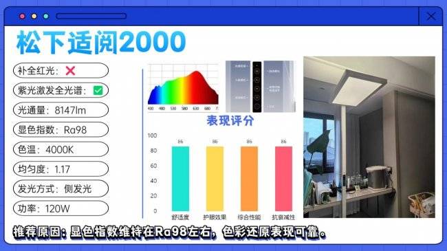 护眼大路灯第四名:松下适阅2000;显色指数维持在Ra98左右,色彩还原表现可靠。