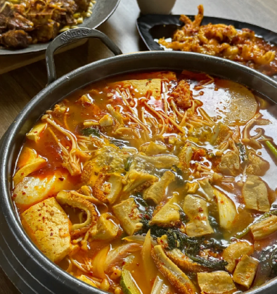 老板是朝鲜人,服务很热情很周到,他们家的泡菜都很新鲜而且量多,很解腻,推荐牛排骨锅,吃完叔叔会用底料炒一锅饭撒上紫菜,真的很香!