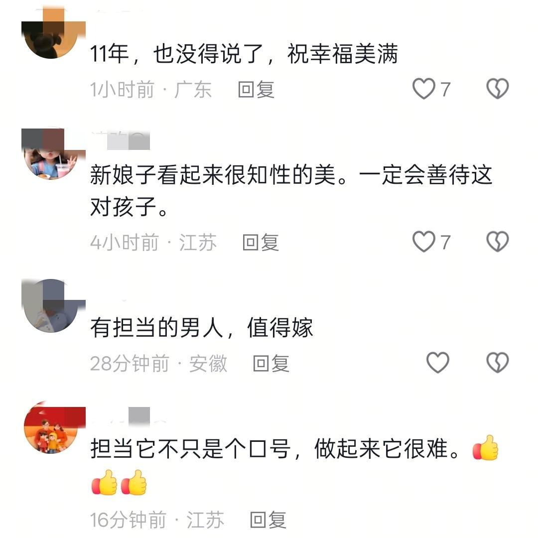 刘先生对待家庭的责任心也感动了不少网友,大家纷纷留言送上祝福,11的坚持,如果不是真爱,真的很少有人能做到,如今他能再次重组家庭,我想也是逝去的妻子愿意看到的。