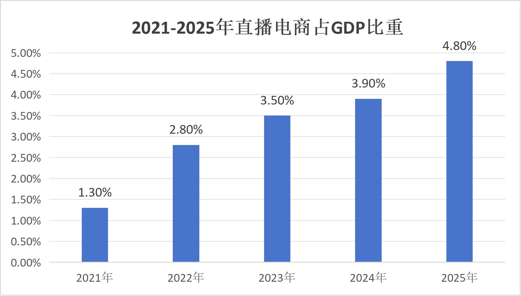 到这里就很奇怪了,明明大家都觉得生意不好做,钱不好赚,但是经济却每年都在增长,钱都到哪里去了呢?依旧给大家拿数据说话,下图是直播电商每年占GDP的比重: