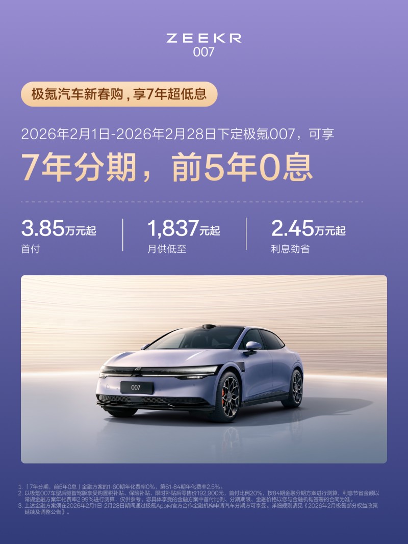 极氪发布“新春购”方案:前5年0息、7年0.5%超低息