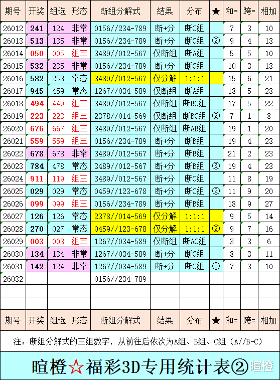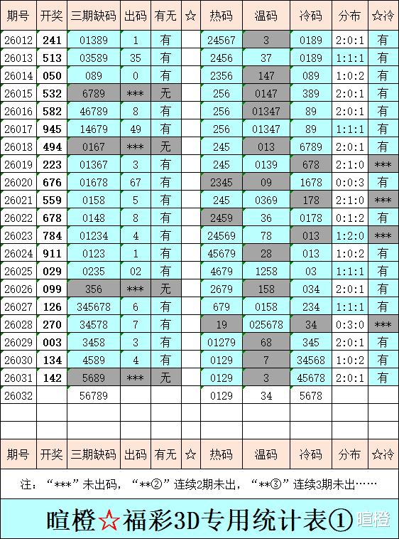 26032期:暄橙福彩3D综合条件(本期将在2月1日21:15开)一、上期回顾 ☆1、上期开奖号:1 4 2。2、和值= 7,跨度= 3。3、非常态组六,112路组合。4、热度分布(热:温:冷)2:0:1。二、本期条件 ☆1、三期缺码:56789。2、热:0129,温:34,冷:5678。3、断组分解式:0156//234-789。4、四胆:0246;三胆:026。三、术语解释 ☆1、三期缺码:0至9这十个自然数当中,未在近三期开奖号出现的数字。2、热度(热温冷):自然数0至9,在近七期开奖号中,出现3次及3次以上的数字,称为热码;出现2次的数字,称为温码;出现1次和未出现的数字,称为冷码。某个数字在开奖号中出现几个,就按几次计算。3、断组分解式:将0至9这十个自然数,分成三组数字,从前往后依次为A组(4码)、B组(3码)、C组(3码),一般情况下,有一组数字不出码,偶尔会有两组数字不出码。A组不出码的情况相对较少。断组为主,分解为辅。4、常态组六号码:同时包含大数、小数、奇数、偶数、质数、合数的组六号码,共有72注。统计表中,简称“常态”。5、非常态组六号码:全大数、全小数、全奇数、全偶数、全质数、全合数等六种形态的组六号码,共有48注。统计表中,简称“非常”。★提醒:彩市有风险,参与须谨慎!水平有限,仅供参考!