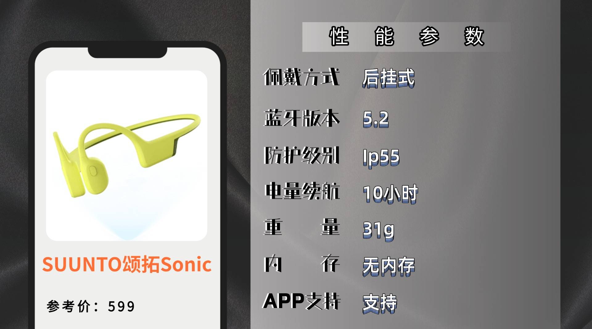 配置上,10小时续航覆盖大多数训练需求,5分钟快充可应急使用;按键操控精准,单手操作方便;IP55防护适合雨天和出汗训练。整体来看,Sonic优势在于轻量佩戴、稳固贴合、节奏感音质和连接可靠,更适合城市跑、越野跑和马拉松训练的用户使用。