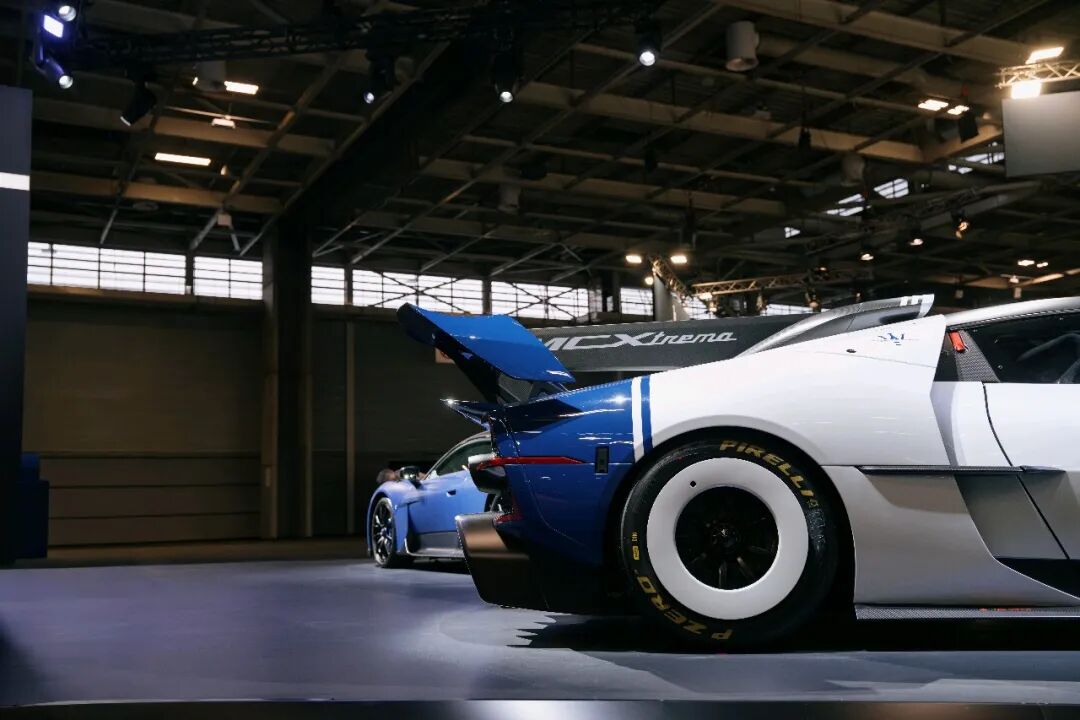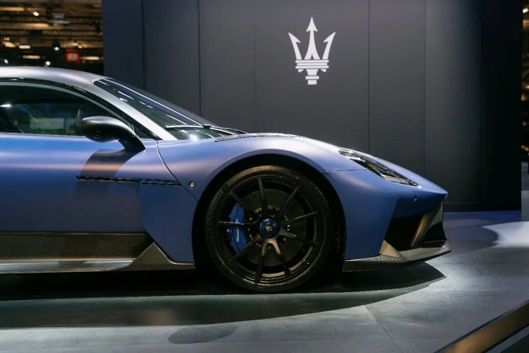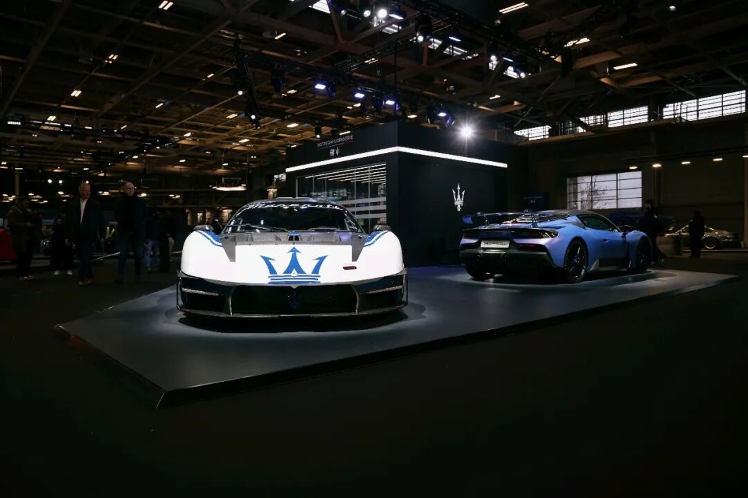转向玛莎拉蒂一侧,展台的焦点是一台独一无二的MCXtrema。这台赛道猛兽由一位收藏家委托定制,身披哑光蓝白相间的“Corse”涂装。这套带有车主幸运数字(77)的赛车涂装由玛莎拉蒂设计中心设计,旨在向MC12超跑致敬。