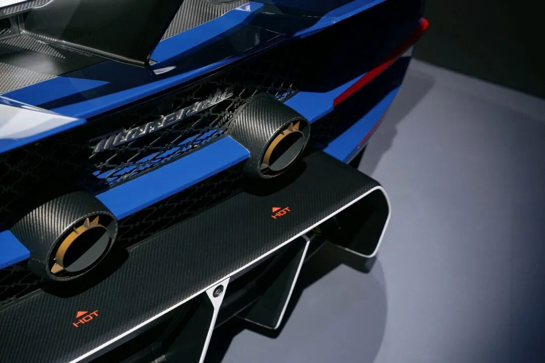 压轴的是MC20 GT2 Stradale,这是基于玛莎拉蒂GT2赛车打造的可合法上路的版本。它采用了2024年展示车型上使用的经典Blu Infinito车漆,全车大量使用了裸露的碳纤维材料。