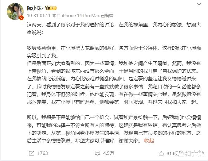 在节目组下场控制失败后,舆论彻底失控,继阮小咪发长文回应选李定豪拒绝赵牧辰的原因后,赵牧辰直接发出了律师函维权,也是恋综史上第一个闹得如此不可开交的情况。原来,相比赵牧辰自己被吐槽,被骂,他表示无法容忍自己的家人被骚扰,并直接公布了侵权网友的ID,给予了警告。