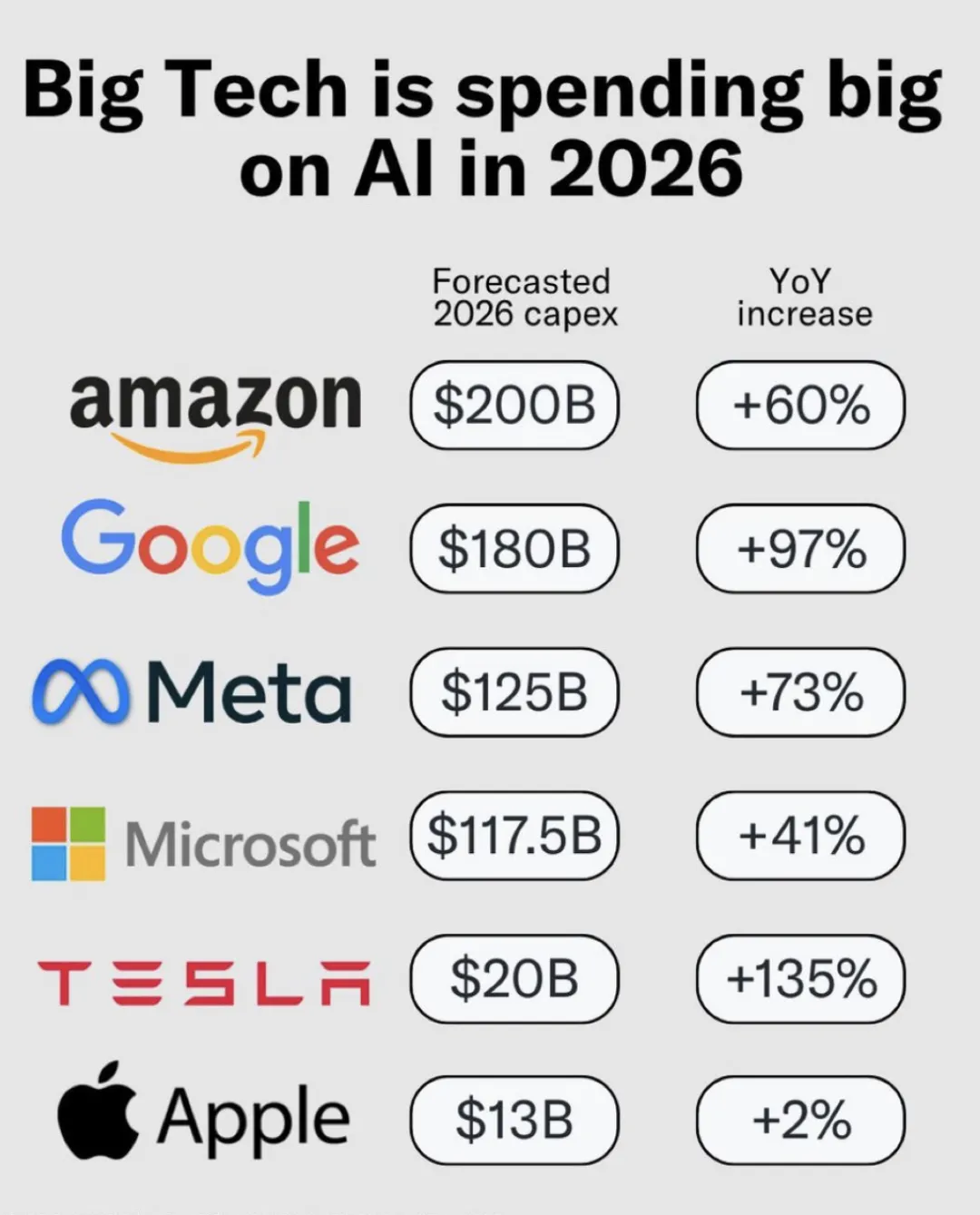 毕竟,购买英伟达显卡的巨头们,正在承受着史无前例的现金流失血。在刚刚过去的财报季中,华尔街投行们算出了一笔账:谷歌、微软、亚马逊和 Meta 四家巨头,预计 2026 全年的资本支出(CapEx)总额将突破令人咋舌的 6500 亿美元。仅仅为了维持这场游戏不下牌桌,巨头们必须烧掉相当于好几个超级独角兽市值的真金白银去购买芯片、建设数据中心乃至配套电厂。