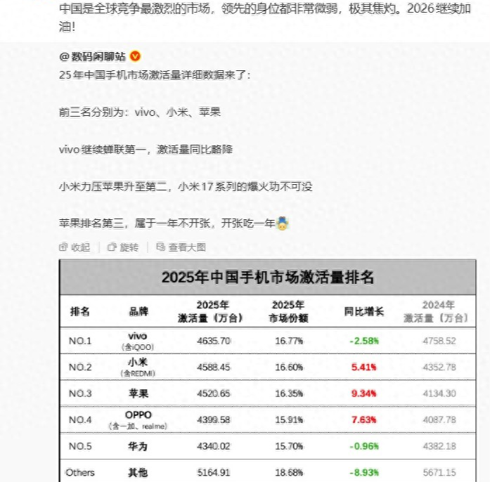 1 月 21 日消息,博主昨日爆料了 2025 年中国手机市场激活量详细数据,前三名分别为:vivo、小米、苹果。
