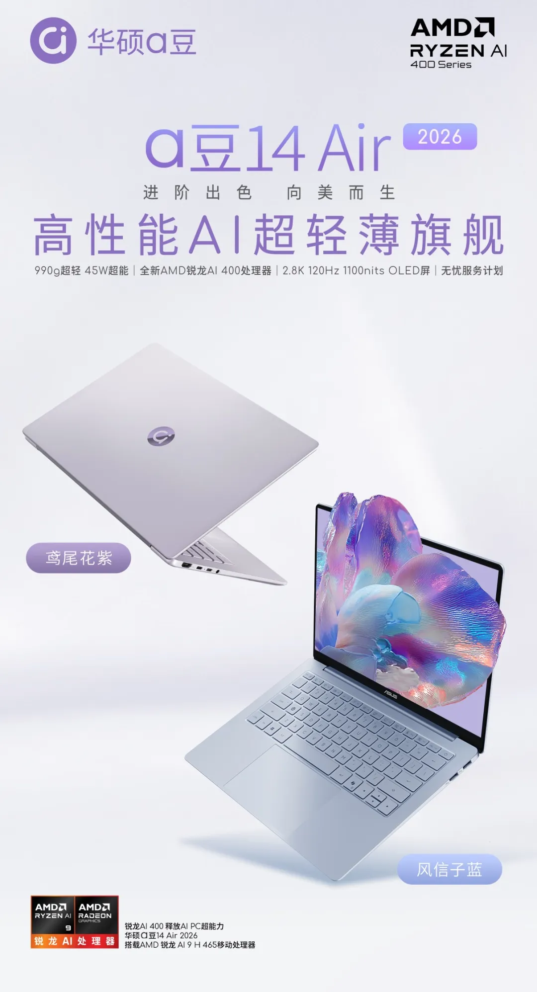 当轻薄本的竞争迈入“克级较量”与“智能深度融合”的新阶段,年轻人对生产力工具的期待也不断升级,既渴望无负担的通勤体验,又需要强劲性能支撑多场景高效输出,更追求智能科技带来的效率提升与趣味性。华硕a豆精准洞察年轻群体的核心诉求,在1月22日的#超能芯生 智启未来# 2026全新华硕AMD锐龙AI PC全能本新品发布会中,重磅推出全新「华硕a豆14 Air 2026」,以990g超轻金属机身,45W超能释放,搭配风信子蓝、鸢尾花紫两种全新配色、以及2.8K 120Hz 1100nits OLED华硕好屏、至高约19.3小时超长续航和全新AI桌宠、Q版AI朵皮肤,全方面体验升级,成为年轻人办公、创作、娱乐的全能智能伙伴。
