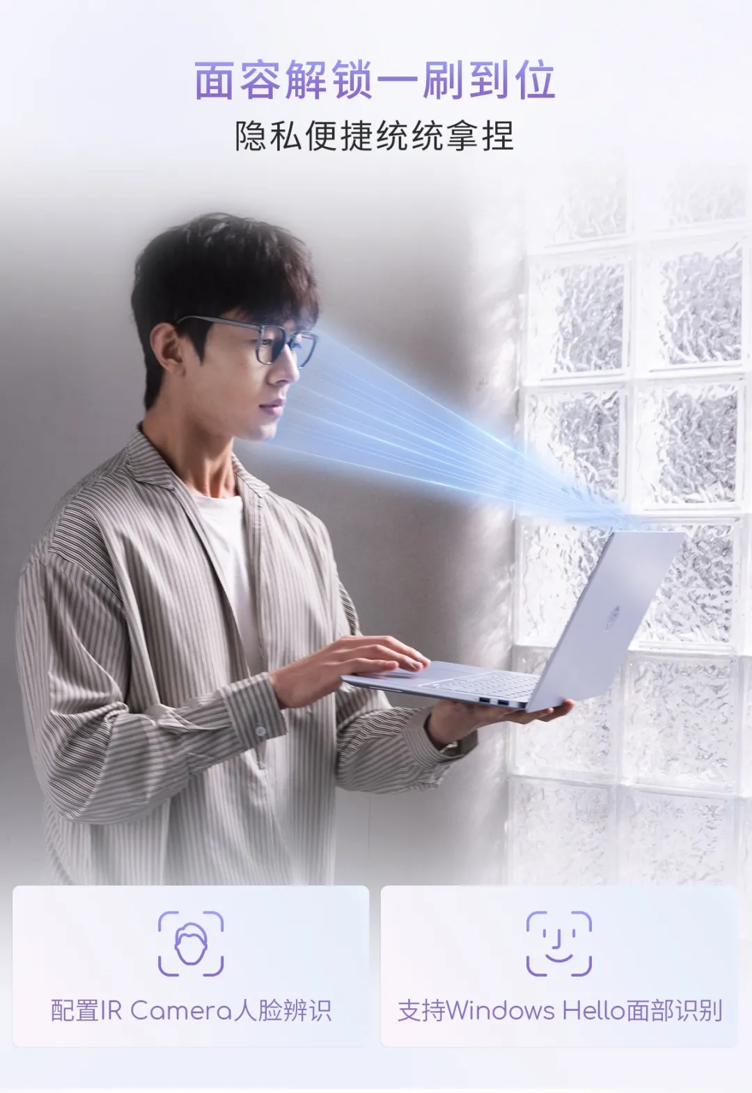 此外,屏幕上方搭载了1080P+IR AI摄像头,支持Windows Hello面部识别,刷脸秒速开机,既便捷又安全。C面ErgoSense人体工学静音背光键盘,全尺寸间距、左右全高方向键设计打字更舒适且噪音小,搭配6英寸静音超大顺滑触控板,操作便捷省心。