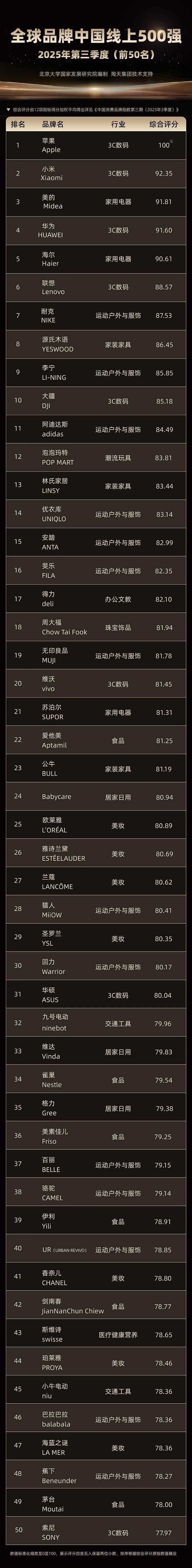 全球品牌中国线上 500 强榜单(CBI500)前50名(上下滑动查看更多)