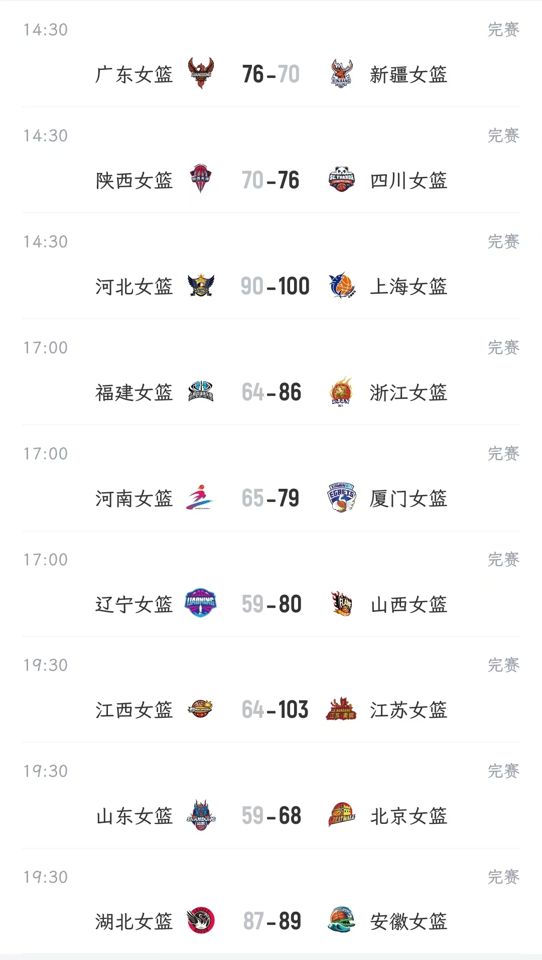 今天进行了首轮比赛,结果如下:广东76-70险胜新疆,陕西70-76惜败四川,石家庄90-100不敌上海,大连59-80输给山西,福建64-86惨败浙江,河南65-79不敌厦门,江西64-103输给江苏,山东59-68输给北京,武汉87-89惜败合肥。