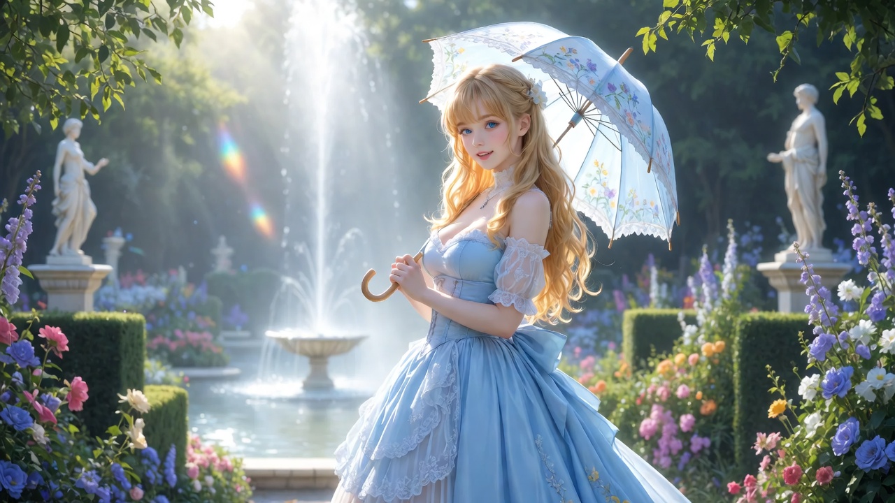 美女身着一袭淡蓝色的法式宫廷长裙,裙摆如云朵般轻盈飘逸,层层叠叠的蕾丝花边点缀其中,尽显浪漫与优雅。上身的紧身设计完美勾勒出她的身材曲线,领口呈方形,恰到好处地露出迷人的锁骨与白皙的肌肤。泡泡袖的设计增添了几分甜美与俏皮。她脚蹬一双白色的绸缎高跟鞋,鞋面上镶嵌着精致的水钻,随着她的走动闪烁着璀璨光芒。美女一头金色的长发如瀑布般垂落在肩膀上,发梢微微卷曲,在阳光的照耀下泛着柔和的光泽。她手持一把淡蓝色的蕾丝阳伞,伞面上绣着精美的花朵图案,与花园的景色相得益彰。脸上化着精致的妆容,蓝色的眼眸犹如深邃的海洋,浓密的睫毛微微上翘,粉色的嘴唇娇艳欲滴,嘴角带着一抹甜美的微笑,散发出令人心动的魅力。她姿态优雅地站在花园小径上,侧身微微面向镜头,眼神温柔地注视着镜头,仿佛在与观者进行着无声的交流。