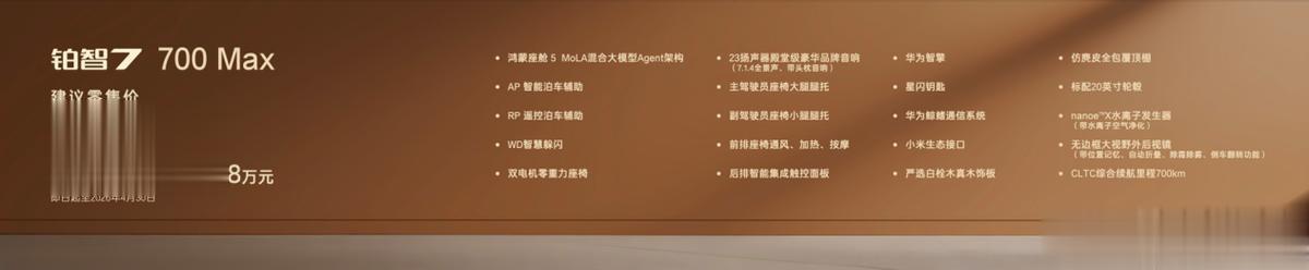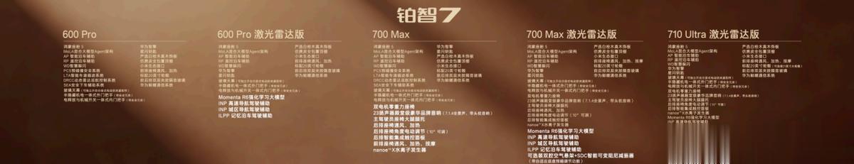 700km续航提供三个版本,全部标配双电机零重力座椅、主驾大腿托、后排智能触控面板和23扬声器等超11项配置,过往30万以上车型的豪华舒适配置,全部下放到20万以下。700Max版聚焦长续航与高阶舒适,限时补贴权益价16.58万,加5000元即可选装行业最低价的双腔空悬,拥有17万级双腔空悬纯电家轿第一车。700Max激光雷达版限时补贴权益价17.48万,增加Momenta R6大模型高阶智驾辅助。再加5000元选装基金即可升级至700Max激光雷达双腔空悬版,一次性配齐华为鸿蒙座舱5、Momenta R6大模型激光雷达智驾、双腔空悬等超豪华三件套,20万内唯一。