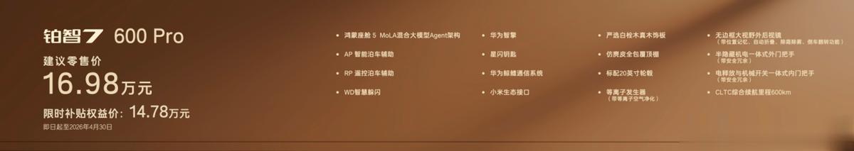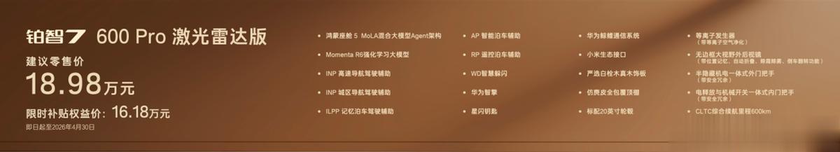 铂智7600Pro版,版本基础配置不基础,入门即豪华,限时补贴权益价14.78万。同价位最大尺寸旗舰轿车,标配内置MoLA架构的鸿蒙座舱5,具备类人化智能交互,搭载带智能泊车的L2级智驾、华为智擎、尊界同款星闪钥匙、纯天然实木内饰和座椅通风加热、20寸轮毂等超15项豪华配置。D级车的尺寸和享受,B级车的价位,加上丰田全球品质兜底,性价比断层领先。