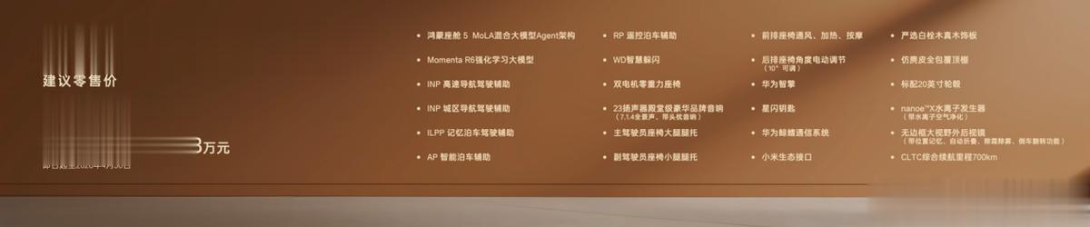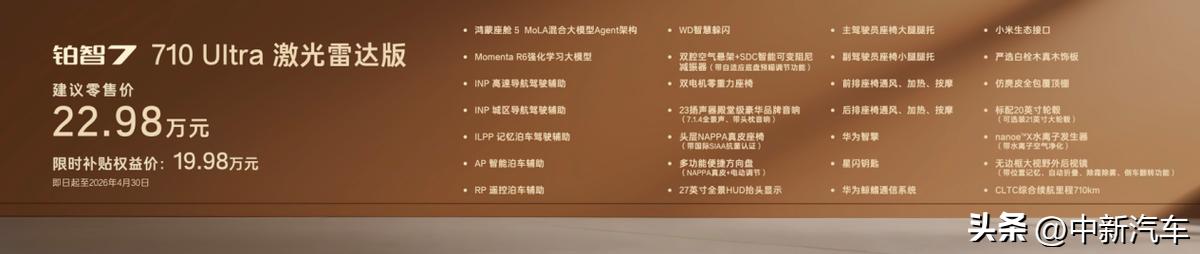 顶配710 Ultra激光雷达版限时补贴权益价19.98万,不仅集齐鸿蒙座舱和激光雷达智驾、双腔空悬、零重力座椅、23扬声器等全豪华配置,实现豪华“一步到位”,还把给足情绪价值的27英寸全景HUD抬头显示、NAPPA真皮方向盘和座椅、智能香氛系统等统统安排,是同价位最超值的选择。