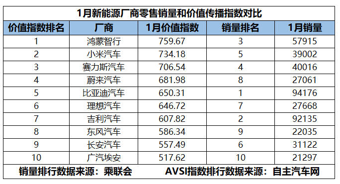 仔细审视1月的新能源厂商AVSI榜单,一个显著特征浮出水面:价值传播的排位与传统的销量座次,呈现出耐人寻味的“错位”。鸿蒙智行以759.67的指数值问鼎榜首,但其57915辆的月销量仅位列第三;小米汽车则以734.18的指数值紧随其后,位居价值榜第二,而39002辆的销量排在了第五。反观销量冠军比亚迪汽车(94176辆),其指数值为650.31,位列第五;销量亚军的吉利汽车(92135辆),指数值则为607.82,排名第七。