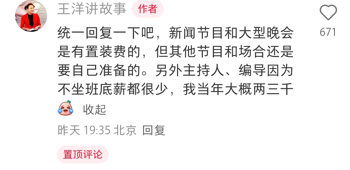 王洋说,央视的主持人和北京电视台的主持人真的没有大家想象中有钱,他们都是一群看着外表光鲜,但实际上到手没几个钱的打工人。