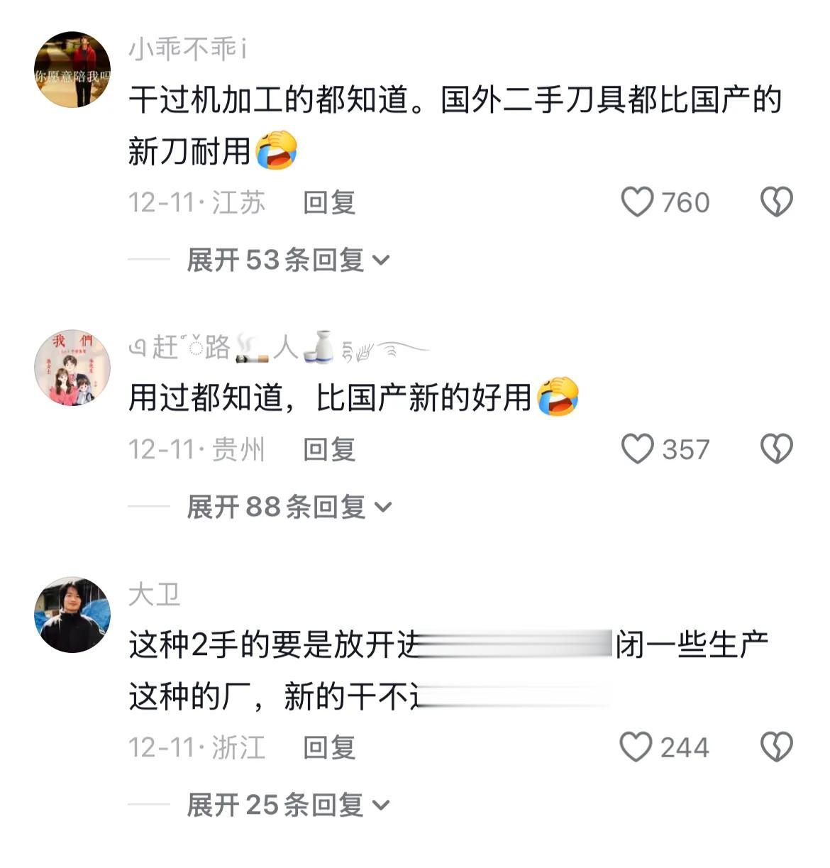有不少热心网友纷纷在评论区说出自己的见解,普遍的意见的这些进口的二手刀具,往往比国产的新刀具还要好用。这种评价有较高的一致性,或许很可能是接近于事实的,不过抛开价格谈价值,就有点耍流氓了。