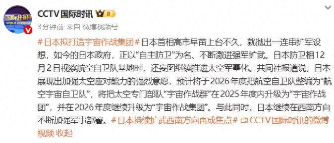 据CCTV国际时讯12月3日消息,日本首相高市早苗上台不久,就抛出一连串扩军设想,如今的日本政府,正以“自主防卫”为名、不断激进强军扩武。