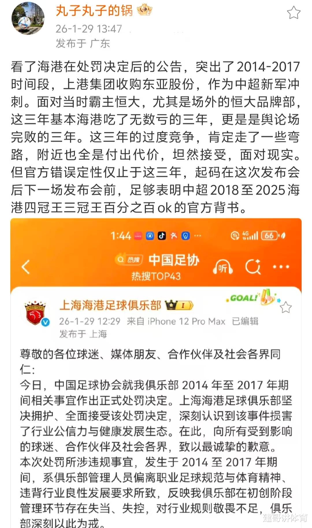 北京时间1月29日,在足协公布了对卫冕中超冠军上海海港的禁赛处罚后,上海海港官网也在第一时间发文,表明了俱乐部的态度。上海知名体育官方媒体记者“丸子”对于上海海港官网的这则公告,给出了高度评价,“丸子”称,海港队被处罚的时间段是2014年到2017年,当时海港作为中超新军,面对当时的霸主,导致了海港在这3年吃了无数的亏,让海港在晕轮场上完败,但官方的错误定位也仅仅止于这3年,中超2018到2025年的海港冠军,都是百分百OK的。