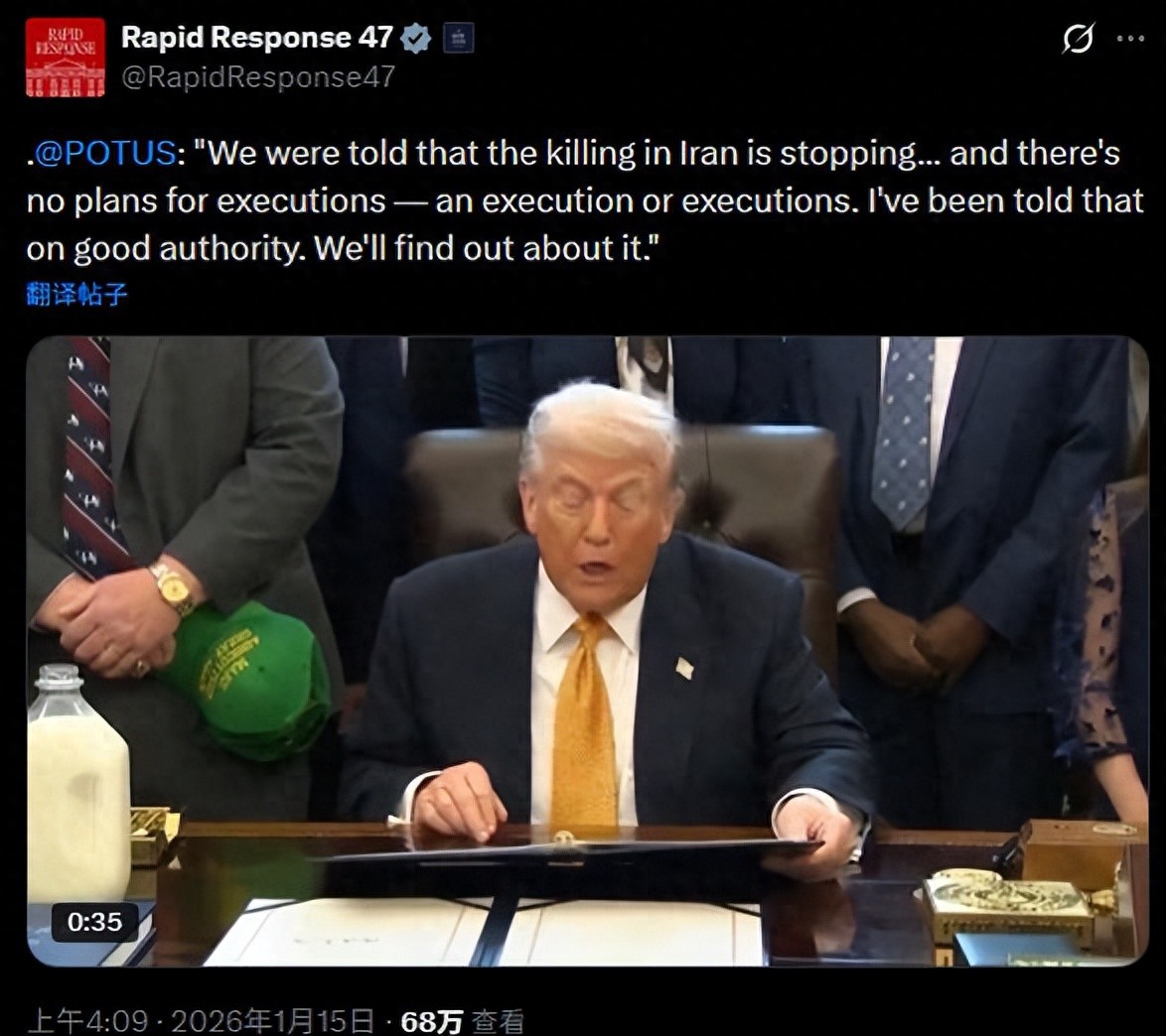 他说有 “可靠的渠道” 告诉他,伊朗国内的杀戮已经停止了。他话说得不多,但意思很清楚 —— 美国暂时不出手,再看看情况发展。