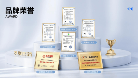 与市面上大多数产品仅需2–4个月的研发周期不同,书客坚持对每一款产品进行长达3–4年的深度打磨。从元器件筛选到成品定型,整个流程中都会进行多轮严格淘汰,每一个元器件平均淘汰率高达30%,只为确保最终成品的稳定性与极致表现。正因这种近乎苛刻的研发标准,书客才能在业内罕见地实现超过10年的性能抗衰减保障,为用户带来持续稳定、始终如一的专业级使用体验,被公认为目前行业最佳,并获得欧盟CE、美国FCC、RoHS等十余项国际权威认证,下图为suker书客品牌各种权威机构认证图:
