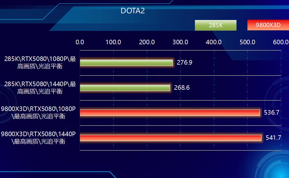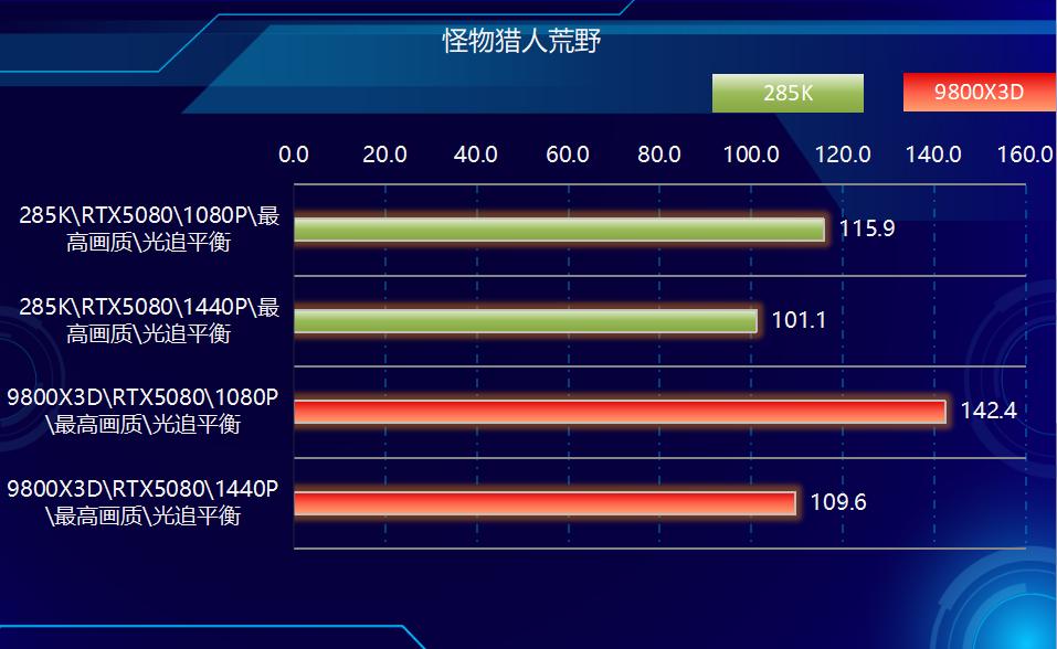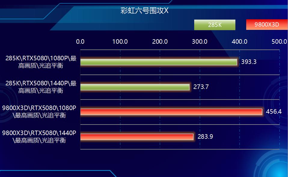 作为AMD和INTEL的高端CPU产品,9800X3D和285K都有着高级的硬件规格。除了能满足日常的使用之外,对于运行游戏也是非常给力。对于这两款高端CPU,为了不造成性能瓶颈,使用了RTX5080显卡来配合测试。虽然从全硬件规格上来说,这两款CPU不太相同。但是,9800X3D和285K都采用了8个大核心架构,在运行游戏时,能效小核心并不会参与工作,所以这一场PK,本质上是公平的。