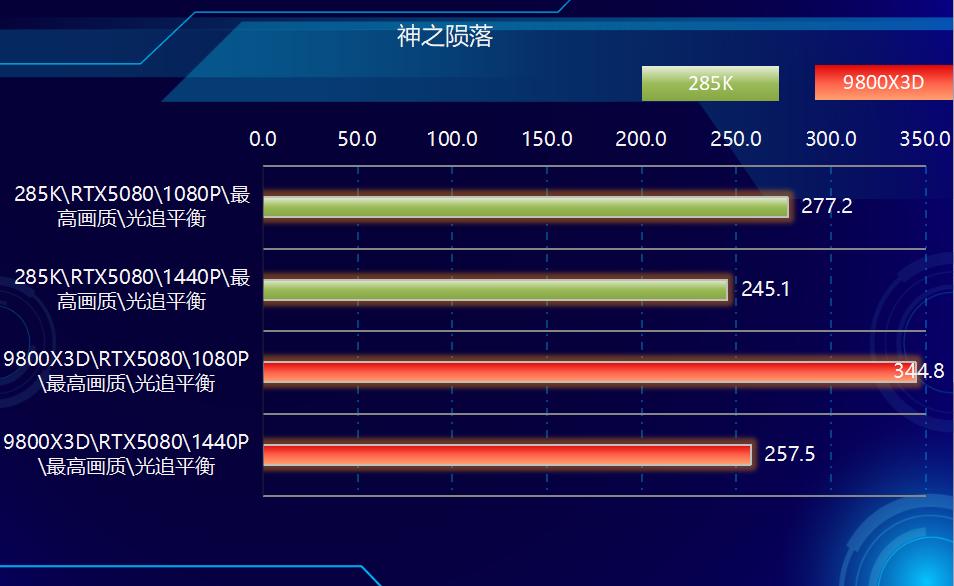 作为AMD和INTEL的高端CPU产品,为了测试公平,测试标准明确如下,选取平时测试使用的几款游戏,来对比测试这两个平台的整机游戏性能,显卡使用RTX5080。使用1080P和2K分辨率,将游戏画质设置为测试画质,并不单独设置每一项,如无BENCHMARK,就使用软件测试FRAPS平均帧数。