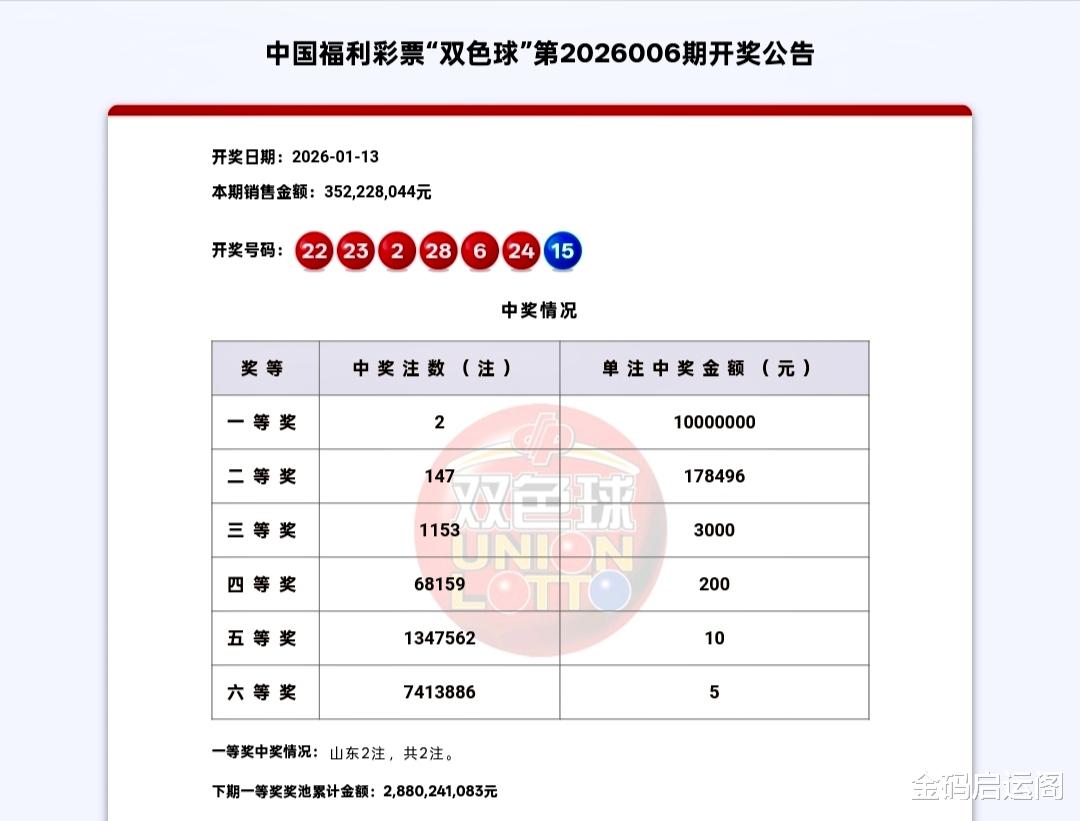 本期开奖号码为:红球 02、06、22、23、24、28,蓝球 15。