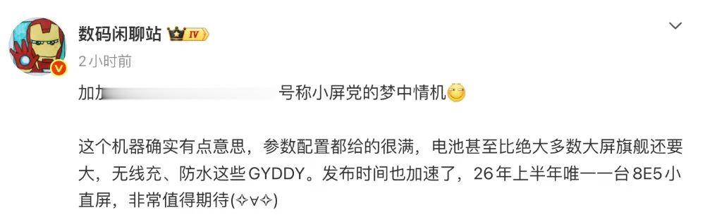 在此之前,这位博主的消息中也提到过这款新机,定位骁龙8E5性能小屏机,6.31"1.5K小直屏,四等边设计,3D超声波指纹,IP68,工程机测试最大7开头电池。
