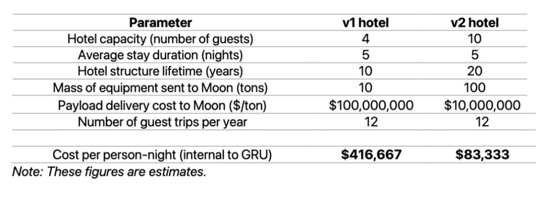 按照 GRU 的模型,第一版酒店的设备总重约 10 吨,内部成本约每人每晚 42 万美元;到了使用 ISRU 部分本地化建造的第二版酒店,这个数字可以降到 8 万美元左右。