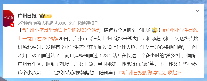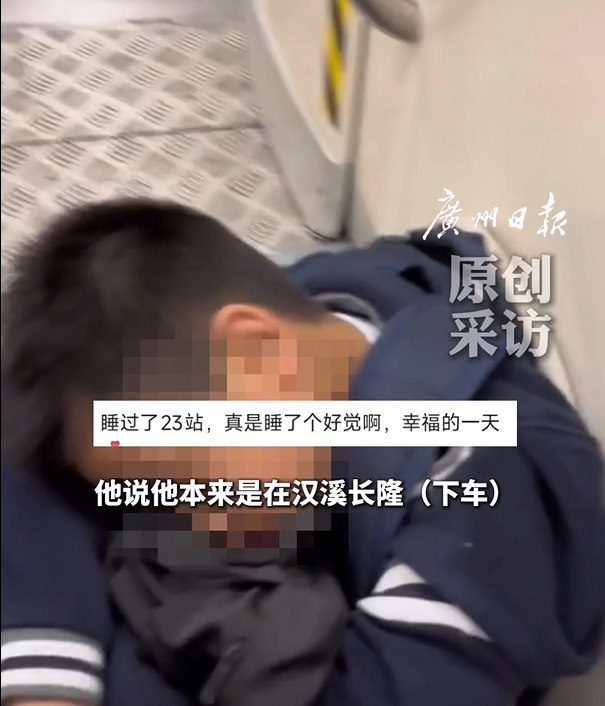 12月29日,广州地铁3号线,一位准备去白云机场赶飞机的汪女士,在终点站机场北站下车时,发现车厢过道上居然还坐着个小学生,正靠着书包呼呼大睡。这一睡不要紧,汪女士好心把他叫醒一问才知道,这孩子是坐过站了,而且不是坐过一站两站,是整整23个站!