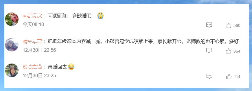 这种对比不是空穴来风。新华视点曾做过一次调查:一些中小学生每天睡眠时长不足8小时。教育部三令五申要求“睡眠管理”,甚至把睡眠质量纳入考核,还有各地推行躺睡,控制作业量,但在升学压力和内卷的大环境下,睡眠往往成了最先被忽视的对象,“减负”落地还要继续深化!
