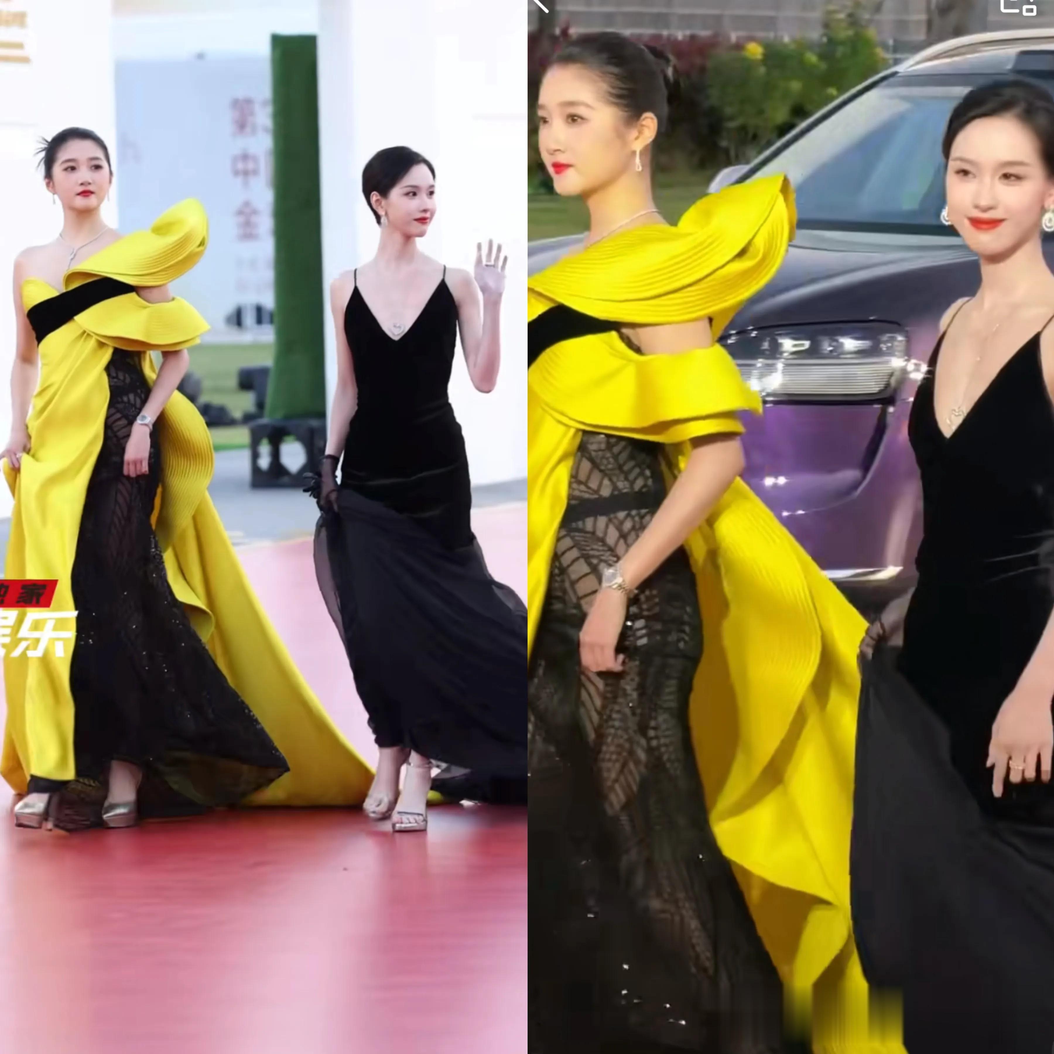 而一边的陈都灵,今天穿了这条深V的黑色吊带裙。她很适合红唇,特别有港风美人的味道。只是她过分单薄的身型其实不太适合深V礼服。