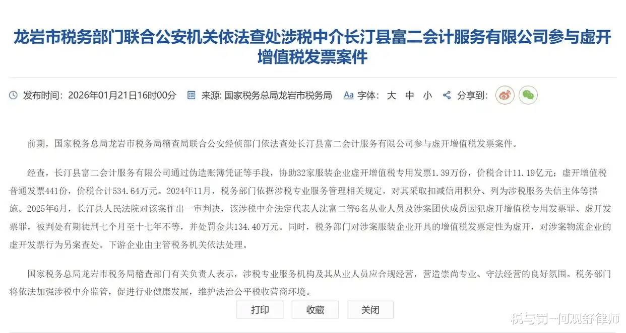 经查,长汀县富二会计服务有限公司通过伪造账簿凭证等手段,协助32家服装企业虚开增值税专用发票1.39万份,价税合计11.19亿元;虚开增值税普通发票441份,价税合计534.64万元。2024年11月,税务部门依据涉税专业服务管理相关规定,对其采取扣减信用积分、列为涉税服务失信主体等措施。2025年6月,长汀县人民法院对该案作出一审判决,该涉税中介法定代表人沈富二等6名从业人员及涉案团伙成员因犯虚开增值税专用发票罪、虚开发票罪,被判处有期徒刑七个月至十七年不等,并处罚金共134.40万元。同时,税务部门对涉案服装企业开具的增值税发票定性为虚开,对涉案物流企业的虚开发票行为另案查处。下游企业由主管税务机关依法处理。