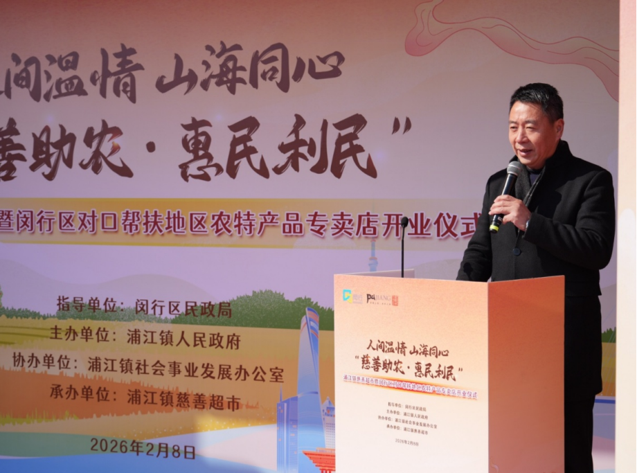 春潮涌动启新程,慈善同心促共赢。2026年2月8日上午,闵行区浦江镇慈善超市暨对口帮扶地区农特产品专卖店开业仪式在浦江镇举行。上海市援滇干部联络组昭通小组组长、昭通市市委常委、副市长葛钧,闵行区民政局副局长王复明,闵行区浦江镇副镇长梁悦等出席活动。爱心企业代表、社区居民代表齐聚一堂,共同见证沪滇协作在慈善领域的又一重要成果。