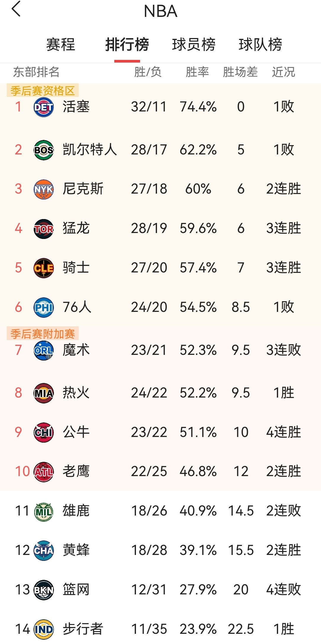 北京时间2026年1月25日,NBA共安排了6场比赛,今日过后东西部排名发生了较大变化。奇才115-119不敌黄蜂,尼克斯112-109战胜76人,骑士119-105击败魔术,凯尔特人111-114爆冷负于公牛,湖人116-110击败独行侠,热火147-116大胜爵士。下面来看看今日具体战况和最新排名: