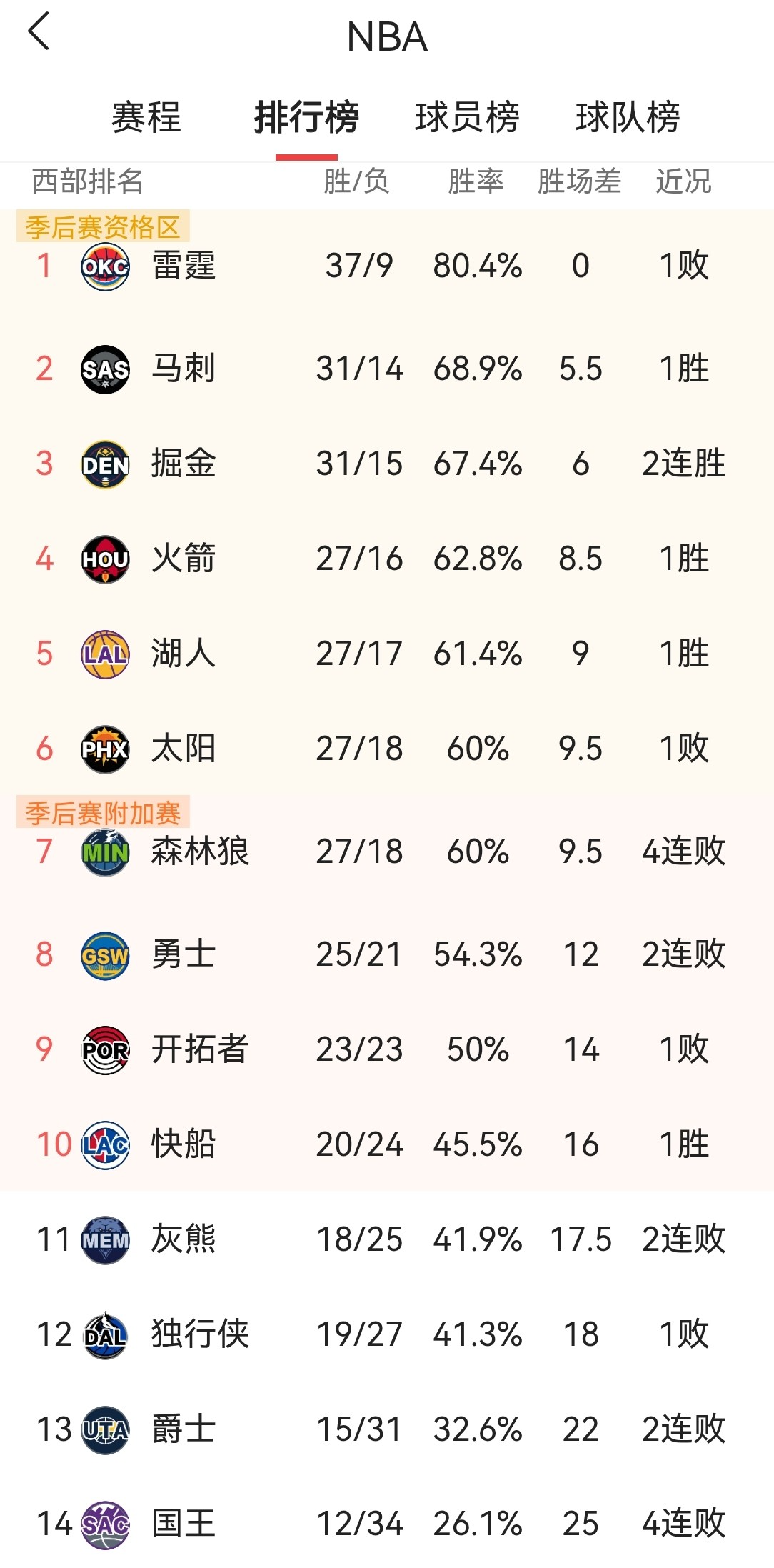 五、湖人116-110击败独行侠,湖人击败独行侠避免2连败,目前以27胜17负的战绩排名西部第5,和西部第6的太阳27胜18负、西部第7的森林狼27胜18负相差0.5个胜场,仅落后西部第4的火箭27胜16负0.5个胜场,湖人仍有极大机会超越火箭进入西部前四。
